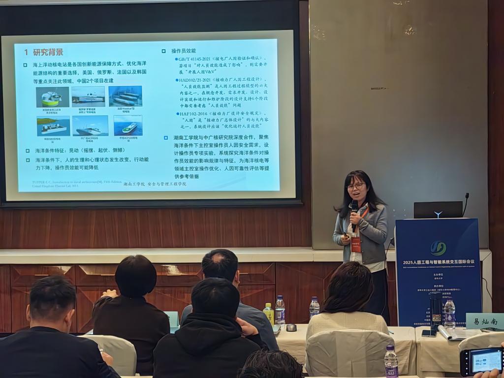 “智能装备系统人因工程”分论坛,易灿南教授分享了我院人因可靠性与安全团队创新性研究成果——“海洋条件下主控室操作员效能研究”,该研究依托beat365官网承担的某核电研究院海上浮动堆重点项目开展,探究了海洋条件对操作员作业绩效的影响及操作员生理、心理特征的变化规律与失误机理,报告内容引起热议,体现了我院在复杂系统人因安全相关领域的研究前沿性与研究积累。