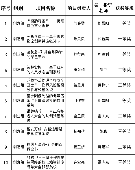 202551519:00,我院16参赛团队安工5601举行了2025大学生创新大赛校内选拔赛。经学生路演,专家组评选,确定高教主赛道《“衡韵雅香”——衡阳特色文化香膏》等三个项目获一等奖,《智护安控——基于AI+的人员状态监测系统》等个项目获二等奖,《银龄哨兵——用AI守护老人安全的跌倒预警系统》等四个项目获三等奖;确定青红主赛道《茶香四溢、花鼓飘湘:非遗文化的和谐交响》项目获一等奖,《一根竹笋的价值重构:越岭山笋的助农实践等两个项目获二等奖,《益起护童-留守儿童的防性侵安全教育等三个项目获三等奖,特此公示。