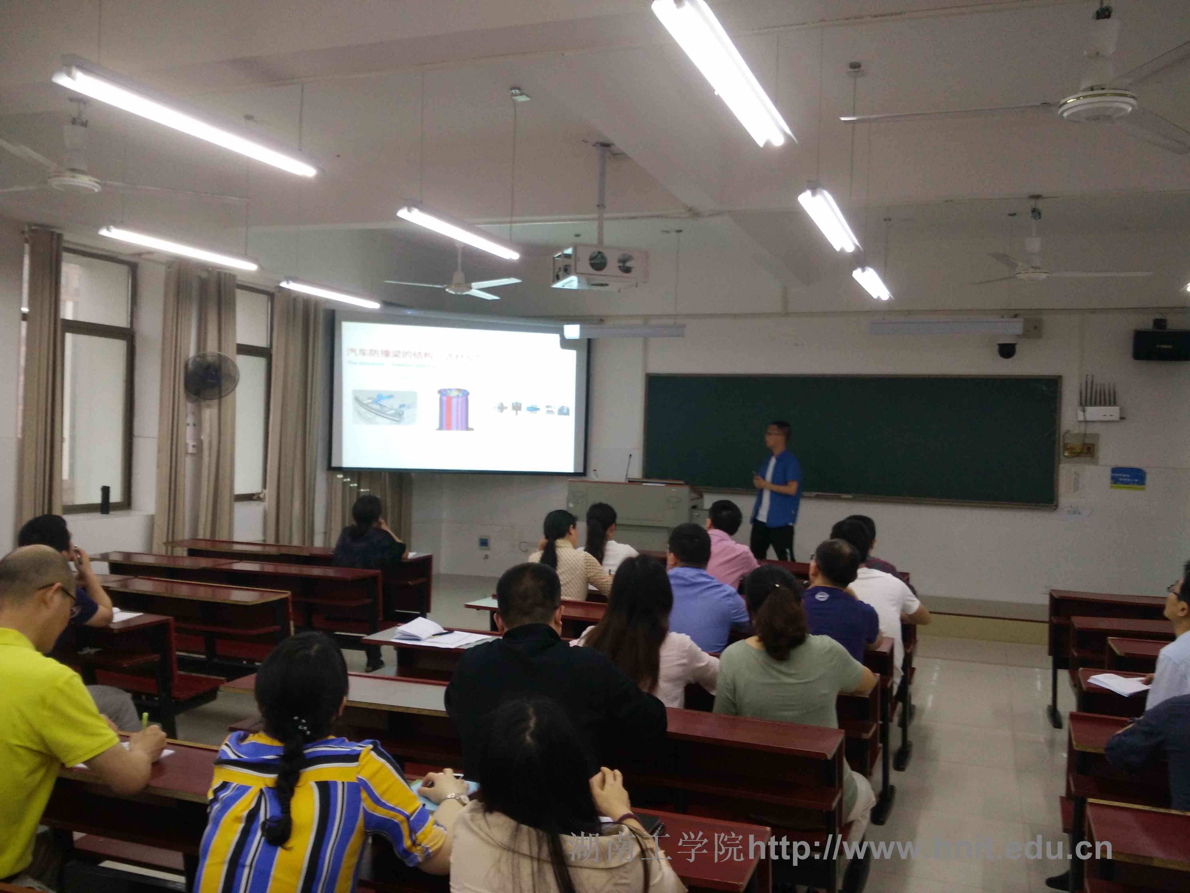 叶拓博士上课主题为《零部件的失效与选材》中的 “汽车防撞梁的结构、选材及加工工艺’”,他通过知识引入从汽车安全知多少导出课程内容、新课讲授环节讲述了本次课程的相关内容、课堂总结回顾本次课程的重点内容和下一节课程的预览内容等教学环节的设计。叶博士在示范课程内容的讲述过程中,结合课程内容的相关知识点,外延到相关马克思哲学的思想内涵、中国的传统文化精髓,并结合社会主义核心价值观,启发学生古为今用,对主题延伸出来的内容进行深入思考和探讨等,巧妙地把学生思政教育融入专业课程教学。在接下来的讲座环节,以 “如何上好一门课程”我主题,从背景介绍、内功修理、外功提升、教学利器个人心得等五个方面讲述个人在教学方面的成长历程和心得体会。叶博士的讲座最后以两个字作为总结“用心”——只要用心定能把教学做好。