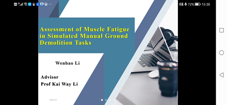 2022年5月22日下午,beat365官网海外学科顾问、台湾中华大学李开伟教授与他的博士生李文宝共同开展关于“模拟人工破拆作业的肌肉疲劳分析”的学术讲座。讲座通过腾讯会议的形式展开,师生们在线观看了本次讲座。