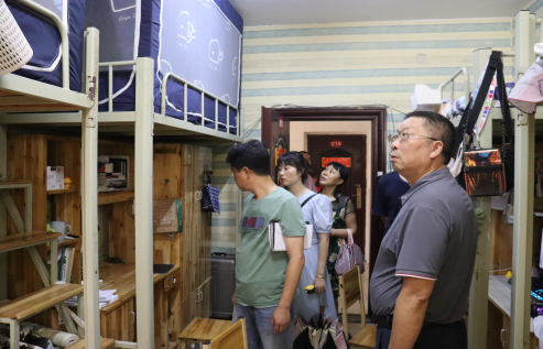 在学生公寓宿舍,刘龙昌副校长仔细查看,对学生使用大功率电器、私接乱拉电线、宿舍卫生脏乱差等问题提出整改意见,要求学管部门、二级学院加强巡查力度,落实整治措施确保宿舍安全,同时要求后勤管理处提高检测、维修效率,避免因开关、线路老化问题引发宿舍火灾。