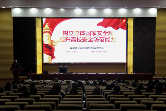 为提高学校教职工的国家安全意识,增强维护国家安全的责任感、使命感,12月16日下午,保卫处邀请衡阳市公安局国保支队支队长王春生在beat365官网500人报告厅举行了一场讲座。讲座面向全体处级、科级干部,全体辅导员,马克思主义学院全体教师,主题为“树立总体国家安全观,提升高校安全防范能力”为主题的国家安全教育讲座,讲座由保卫处副处长张帆主持。