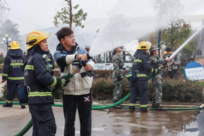 珠晖区消防大队东山消防站的工作人员在现场进行灭火演练和应急逃生演练,指导师生员工正确使用消防器材,使用干粉、水带灭火,做到理论与实践相结合。