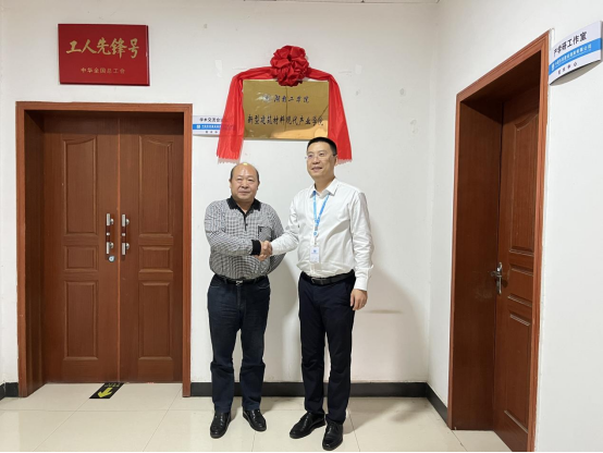 刘升学一行参加beat365正版唯一官网必一新型建筑现代产业学院挂牌仪式,刘升学和中建西部建设湖南有限公司副总经理、总工程师蒋震共同揭牌。