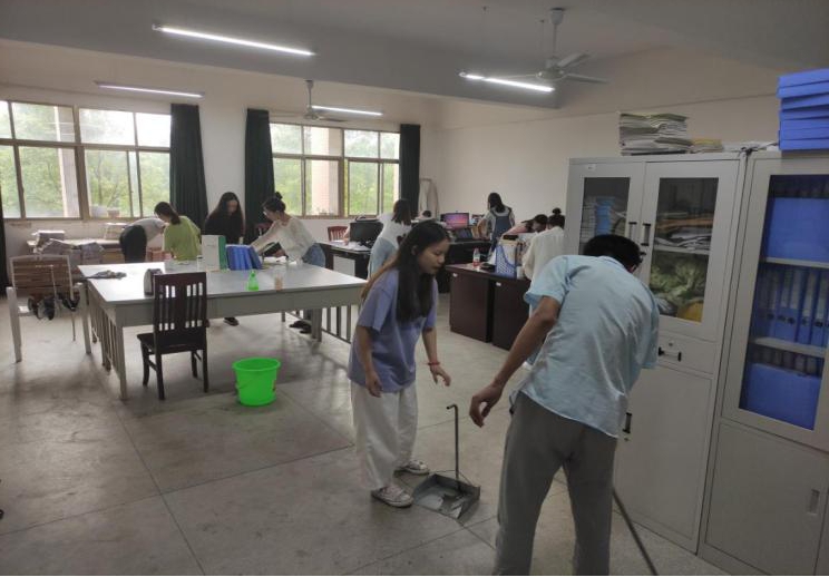 三个学生支部分为三个队伍前往不同专业的办公室,依次向正在辛勤办公的教师们致以最诚挚的祝福后,便开始扫地、拖地、擦桌子、整理桌面书籍并分类捆好等一系列活动。