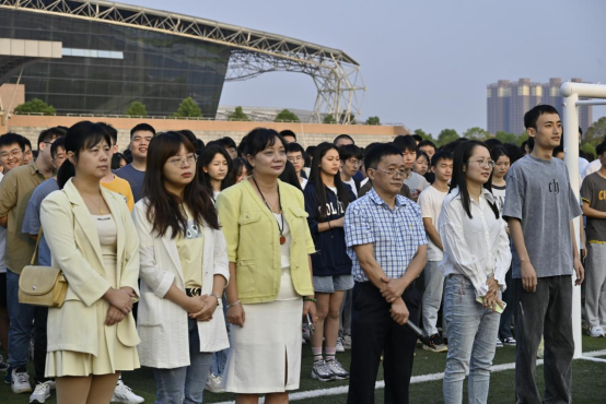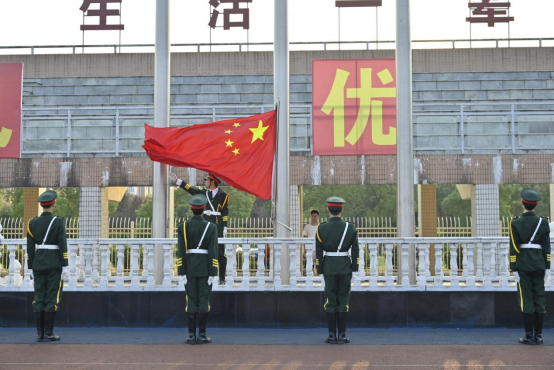 国旗护卫队迈着整齐统一的步伐,把五星红旗护送入场,伴随着雄伟庄严的国歌,五星红旗在朝阳的照射下冉冉升起、迎风飘扬,全体师生肃穆而立,向国旗行注目礼。