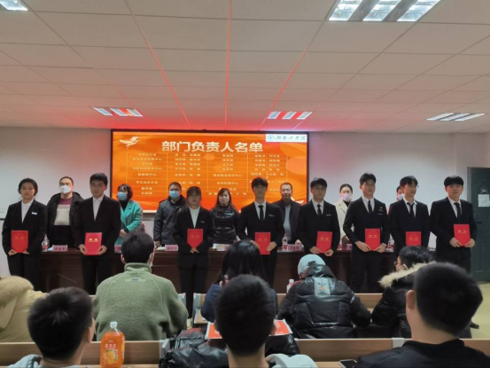 主席台领导为第十五届团委·学生会和学工办助理团队部门负责人颁发聘书。