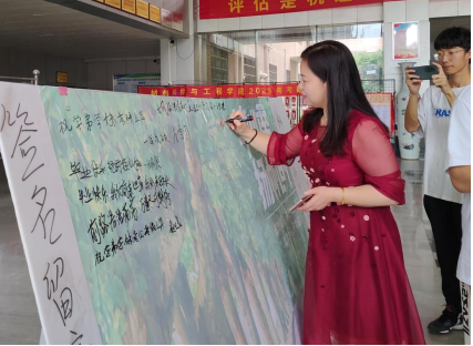 6月6日,材料学院在材化楼1楼大厅、创新创业园3楼、毕业生宿舍楼前开展打卡签名、送文创礼品、毕业生捐书送别2023届毕业生活动,学院党委书记刘赢时写下“前程似锦”祝福毕业生,参加活动的毕业生络绎不绝,纷纷以留言方式来抒发对母校的深情厚谊,对师友的不舍与希冀,还与留言墙合影留念。