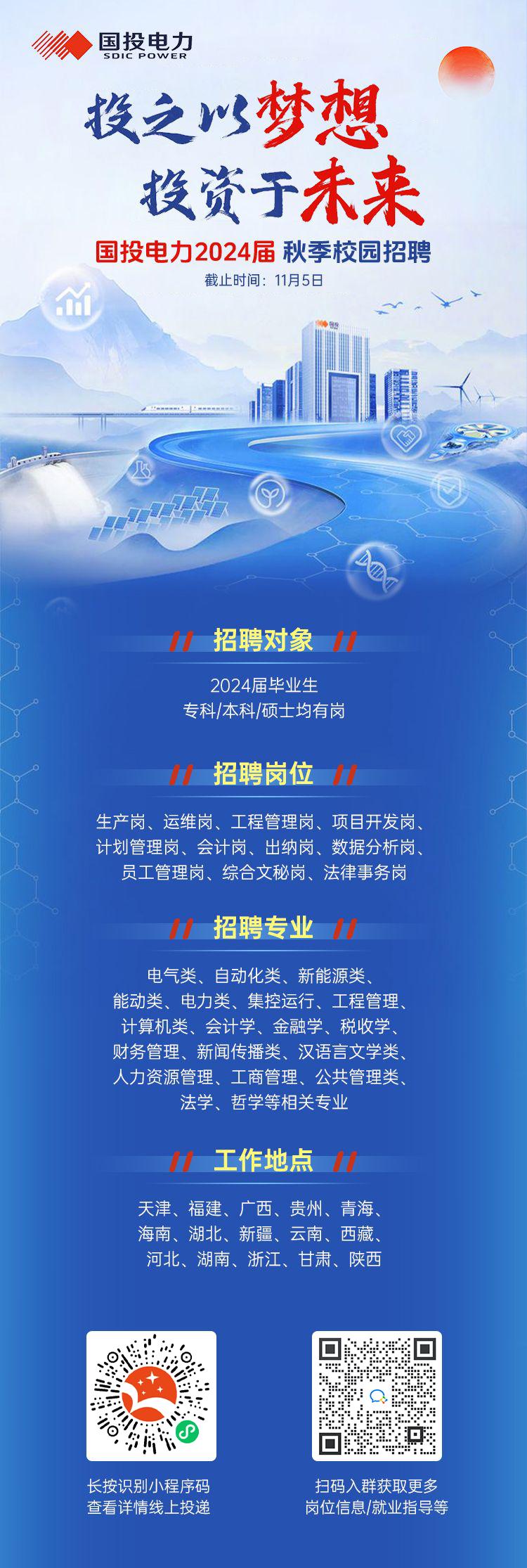 招聘专业:电气类、自动化类、新能源类、能动类、电力类、集控运行、工程管理、计算机类、会计学、金融学、税收学、财务管理、新闻传播类、汉语言文学类、人力资源管理、工商管理、公共管理类、法学、哲学等相关专业