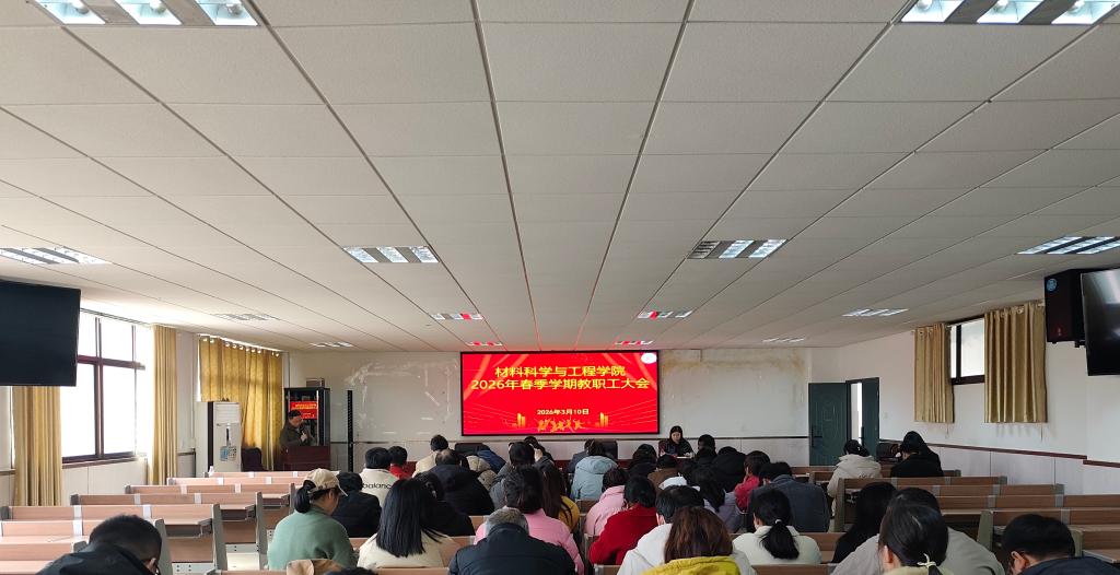 为全面部署新学期各项工作,进一步统一思想、凝聚共识,确保学院各项工作开好局、起好步,3月10日下午,材料科学与工程学院在1301召开2026年春季学期全体教职工大会。学院党政领导班子成员及全体教职工参加会议。会议由学院党委书记刘赢时主持。