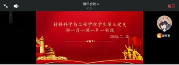 7月13日,材料科学与工程学院学生第三党支部于线上开展“一月一课一片一实践”主题党日会议,全体党员参加,支部书记黄依卓主持。