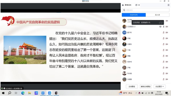 2023年8月8日,材料科学与工程学院学生第一党支部通过腾讯会议开展了学习《中国共产党自我革命的实践逻辑》《习近平主持二十届中共中央政治局第七次集体学习的重要讲话》《“两带头五整治”纠风防腐专项行动》文件,观看“习近平讲述的故事:嘎拉村的美好生活”的主题党日活动,会议由党支部书记冯志敏主持。