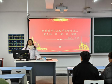 12月24日,材料科学与工程学院学生第三党支部于材化楼1406开展十二月“一月一课一片一实践”主题党日活动,支部全体党员参加,支部书记黄依卓主持会议。