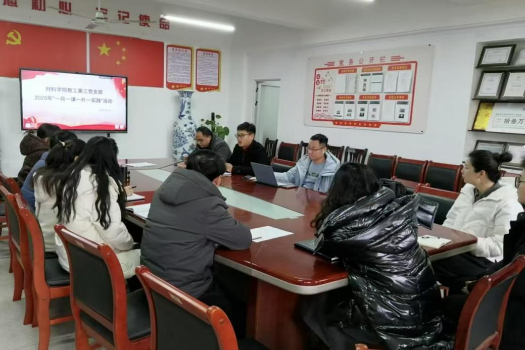 1月14日下午,材料科学与工程学院教工第三党支部在1401会议室开展一月份“一月一课一片一实践”主题党日活动,活动由支部书记张涛主持,全体党员参加。