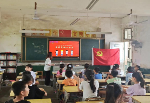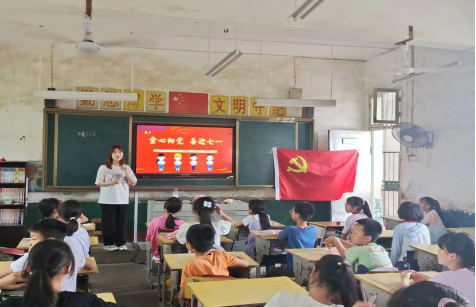 在党的102岁生日来临之际,为全面深入学习贯彻党的二十大精神,实施全环境立德树人,引导广大青少年儿童从小听党话、颂党恩、跟党走,让红色基因、革命薪火代代传承。beat365正版唯一官网必一材料科学与工程学院赴衡阳市珠晖区茶山坳镇“护绿水青山,助乡村振兴”暑期社会实践团于6月30日上午来到茶山小学开展“童心向党,喜迎七一”宣讲活动。