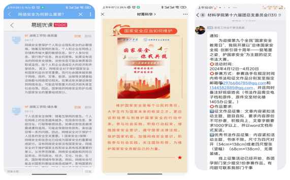 特色活动联动抓,打造安全教育“新阵地”。面向材料科学与工程学院全体学生联动开展国家安全教育征文、书法、微话题大赛,引导学生主动学习宣传国家安全知识,创作国家安全教育相关作品,依托易班网络思政平台,组织学生积极参与安全教育微话题互动,截至目前共发布话题17个,学生参与讨论350次,我院学生积极响应号召,争做国家安全的“宣传者”“践行者”和“守护者”。