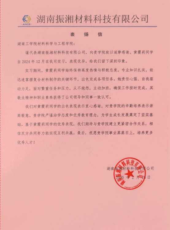 近日,学院收到一封来自湖南振湘材料科技有限公司的感谢信,信中对学院复材专业2021级毕业实习生黄霞莉同学在工作中展现出的优秀专业素养、扎实技能水平和良好职业精神给予了高度评价,并对学院人才培养质量表示高度认可。