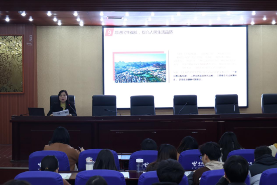 刘赢时同志以《学深悟透党的二十大精神 为新时代新征程贡献力量》为主题,向全体学生干部上了一堂生动的党课。她从“高举一面旗”“紧绷一根弦”“守住一个魂”“走好一程路”四个方面的内容出发,细致讲解了如何全面系统把握党的二十大精神。授课现场,学生积极回答提问,氛围热烈,注重启发式教学,在与学生的一问一答中带给学生更多的思考,深入推进党的二十大精神入脑入心。