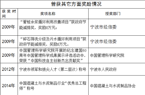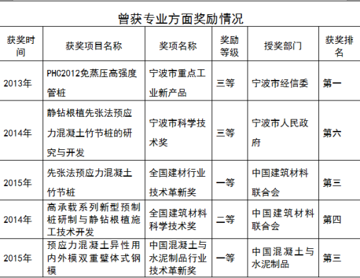 9、2012年参与集团关于宁波市住建委批复的研发项目:(1)静钻根植先张法预应力混凝土竹节桩研究与开发宁建科2011—22号;(2)复合配筋先张法预应力混凝土管桩研究与开发宁建科2011—21号项目的研究,承担工艺研究的工作,该项目于2013年5月通过宁波市住建委组织的专家成果鉴定。年可增加经济效益3500万元,实现新的利润额约700万元。