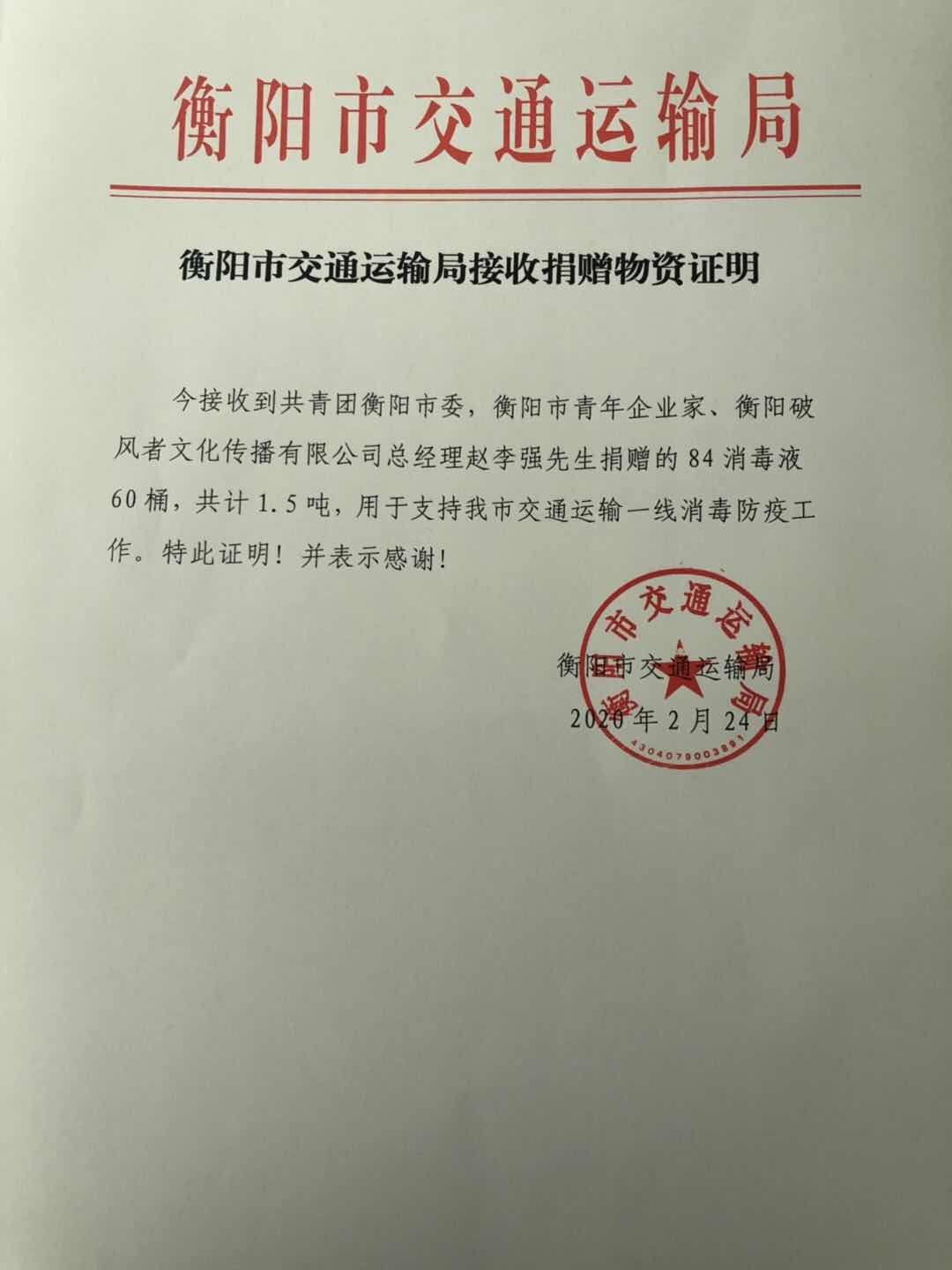 疫情期间,赵李强每天都在家关注武汉及衡阳的疫情状况。武汉严重的疫情,让他在家坐立不安,萌生了开车送防疫物资去武汉的想法,因为多种因素的影响,赵李强未能如愿,这也成为了他心中的一大遗憾。远的送不了,送就近的。赵李强了解到衡阳交通运输疫情防控-线消毒防护用品紧缺的消息后,及时与衡阳市交通运输局取得联系表达心意,市交通运输局同意接受捐赠后,第一时间采购防疫物资。