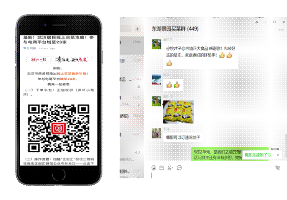 “里面的人不敢出去,外面的人不想进来。为安全起见,自从疫情爆发我们就很少出小区了,买菜确实是个问题。”来自洪山区梨园社区某小区的陶女士说“超市人流量密集并且经常缺货,今年的食材都是从微信(正创校园小程序)上订的,速度很快,直接去团长那里领,着实省了不少麻烦。”