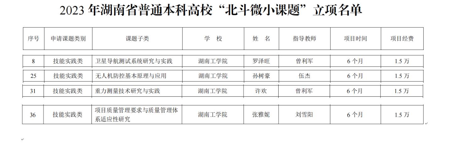近日,湖南省教育厅发布了《关于公布2023年湖南省普通本科高校“北斗微小课题”立项结果的通知》。2023年湖南省普通本科高校“北斗微小课题”分为技能实践类、应用研究类两个类别,在籍全日制本科2020级学生均可申请,beat365官网共申请了6项,立项4项。