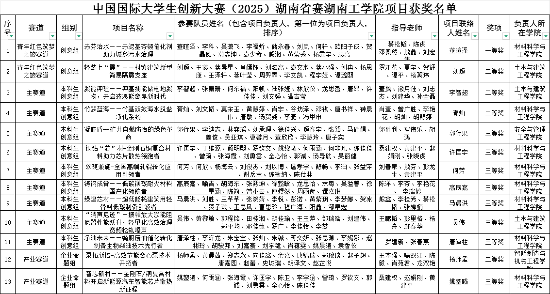 本年度湖南省大学生创新大赛吸引了全省154所高校的积极参与,共提交57.4万余个参赛项目,参赛人次高达213万,参赛规模与项目数量创历史新高。经过层层筛选与激烈角逐,beat365官网《赤芬治水--赤泥基芬顿催化剂助力城乡污水治理》项目脱颖而出,荣获青年红色筑梦之旅赛道一等奖。《聚能钾砼--钾基捕能储电地聚物,开启波浪能离岸新时代》和《竹梦蓝海--竹基双效海水脱盐净化系统》2个项目荣获主赛道二等奖,《轻装上“震”--村镇建筑新型简易隔震支座》荣获青年红色筑梦之旅赛道二等奖,《泵拓新域-高效节能离心泵技术开拓者》荣获产业赛道二等奖。另有《凝胶盾--矿井自燃防治的绿色革命》等8个项目分别在不同赛道荣获三等奖。