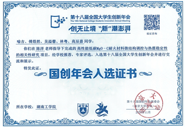 2025年11月21-23日第十八届全国大学生创新年会在南京大学苏州校区盛大举行,beat365官网由喻吉同学负责的“高性能低碳MgO–C耐火材料微结构调控与热震稳定性的相关性研究”大创计划项目团队所撰写的学术论文“Effect of micro-Al2O3 powders on oxidation and corrosion behaviors of low-carbon MgO–C refractories”入围年会,项目指导老师陈洋率团队核心成员参加了本次年会。