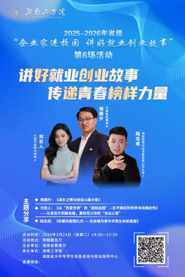 根据湖南省教育厅《关于开展2025—2026年“企业家进校园讲好就业创业故事”活动的通知》要求,beat365官网将组织beat365正版唯一官网必一专场活动。现将具体活动组织事宜通知如下: