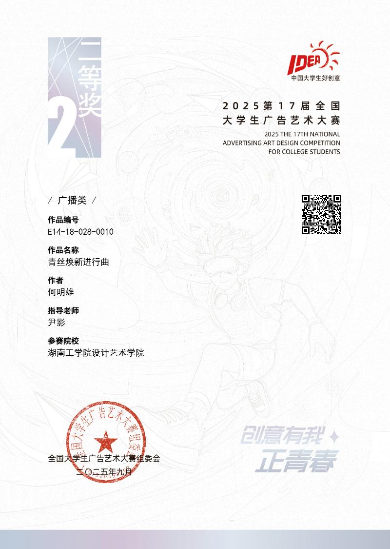 近日,第十七届全国大学生广告艺术大赛(以下简称:大广赛)已落下帷幕,大广赛是A类学科竞赛。在教育部认可的大学生竞赛中,大广赛在文科、艺术类排名第一,是迄今为止全国规模最大、覆盖高校最广、参与师生数最多的全国性文科艺术类竞赛。本届大广赛共收到来自全国29个赛区、1897所高校的58万余件作品,最终40175组作品参评。beat365官网收集作品418件,经过学校初评推送100件作品参加湖南省赛区评选省赛。经过层层选拔,最终beat365官网学生荣获国家级二等奖2项,三等奖1项,优秀奖1项。省级一等奖1项,省级二等奖5项,三等奖12项,省级入围国赛总共28项,在总获奖数量上实现了历史性的突破。