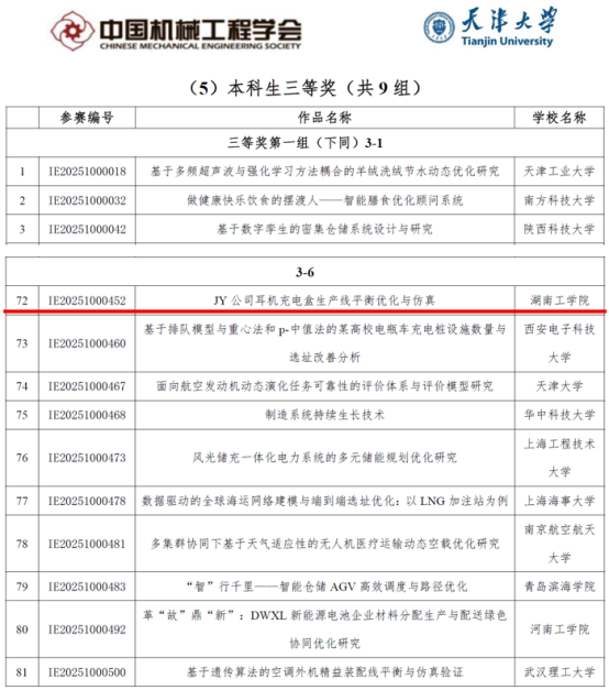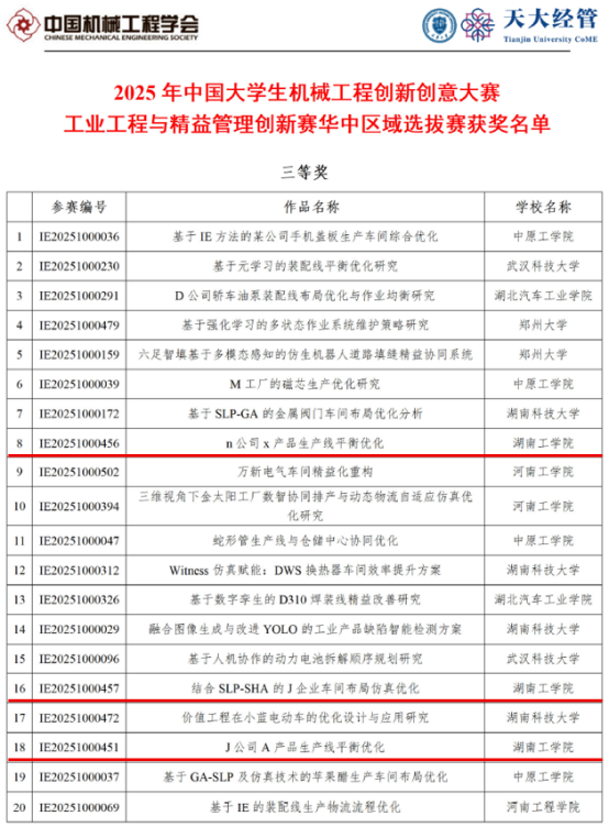 近日,2025年中国大学生机械工程创新创意大赛工业工程与精益管理创新赛全国总决赛(以下简称全国总决赛)在天津大学圆满落幕。beat365官网大学生团队首次参赛,从校赛中推出5个团队,共24名学生进入华中区域赛。团队凭借出色表现,从众多参赛队伍中脱颖而出,一举斩获国家三等奖1项,华中区域赛三等奖3项。
