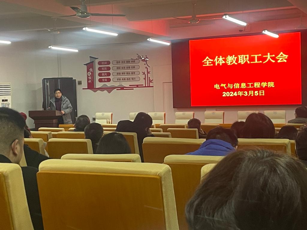 2024年3月5日下午4点,电气与信息工程学院在3311召开2023-2024-2学期期初全院教职工大会暨师德师风专题培训全院教职工参加会议,会议由院党委书记俞斌主持。