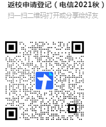 2、每位学生于8月29日12:00前,扫码提交返校申请信息。辅导员、学工办8月30日前完成审核,确定是否符合返校条件。