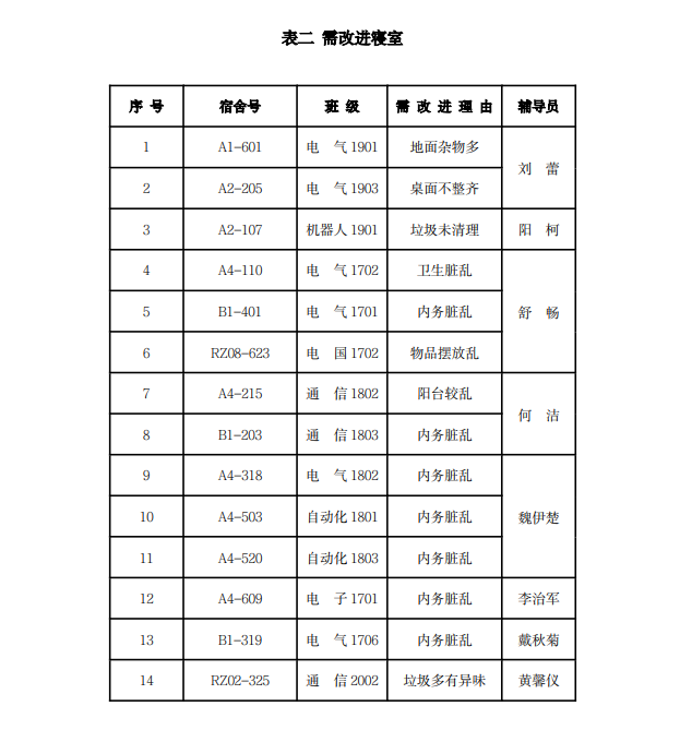 2021年上半年文明宿舍建设活动第十一周,我院“文明宿舍创建活动”工作组本着“公平、公正、公开”的原则,对我院全部宿舍进行了彻底检查。现将检查结果公布如下: