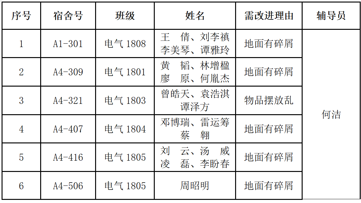 2021年下半年文明宿舍建设活动第十一周,我院“文明宿舍创建活动”工作组本着“公平、公正、公开”的原则,对我院全部宿舍进行了彻底检查。现将检查结果公布如下:
