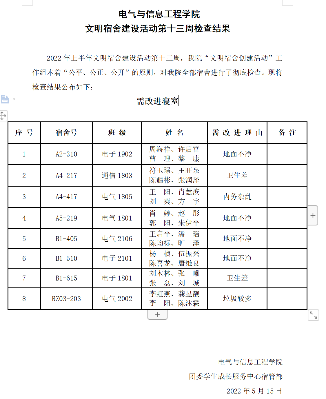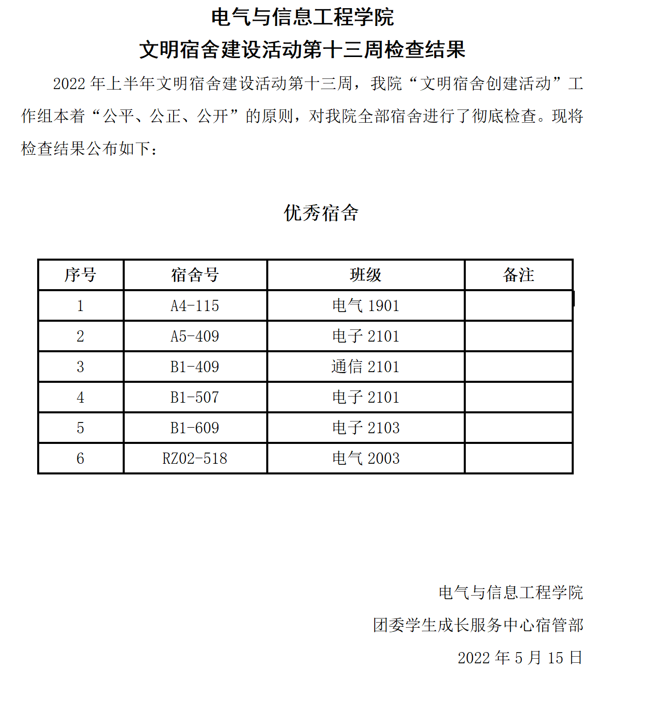 电气与信息工程学院 文明宿舍建设活动第十三周检查结果