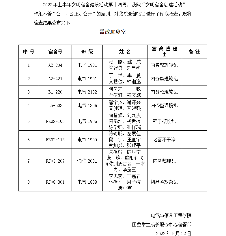 2022年上半年文明宿舍建设活动第十四周需改进宿舍