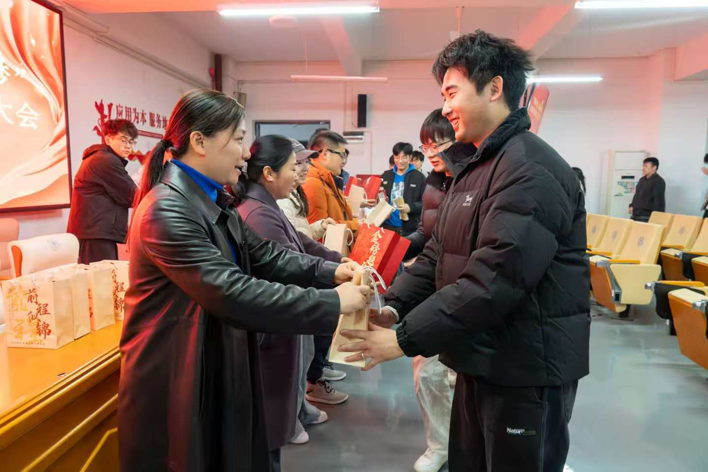 教师为同学们送上“金榜题名”暖心礼包:有印着“上岸有你”的饼干,空白格子里藏着“未来可期”2026日历;“愿你‘苹’安上岸的平安果;“精力旺旺、分数旺旺”的旺仔牛奶。现场气氛热烈,掌声、祝福声此起彼伏。同学们高举礼包,齐声喊出“一战成硕,青春无悔”的铿锵誓言,将大会推向高潮。