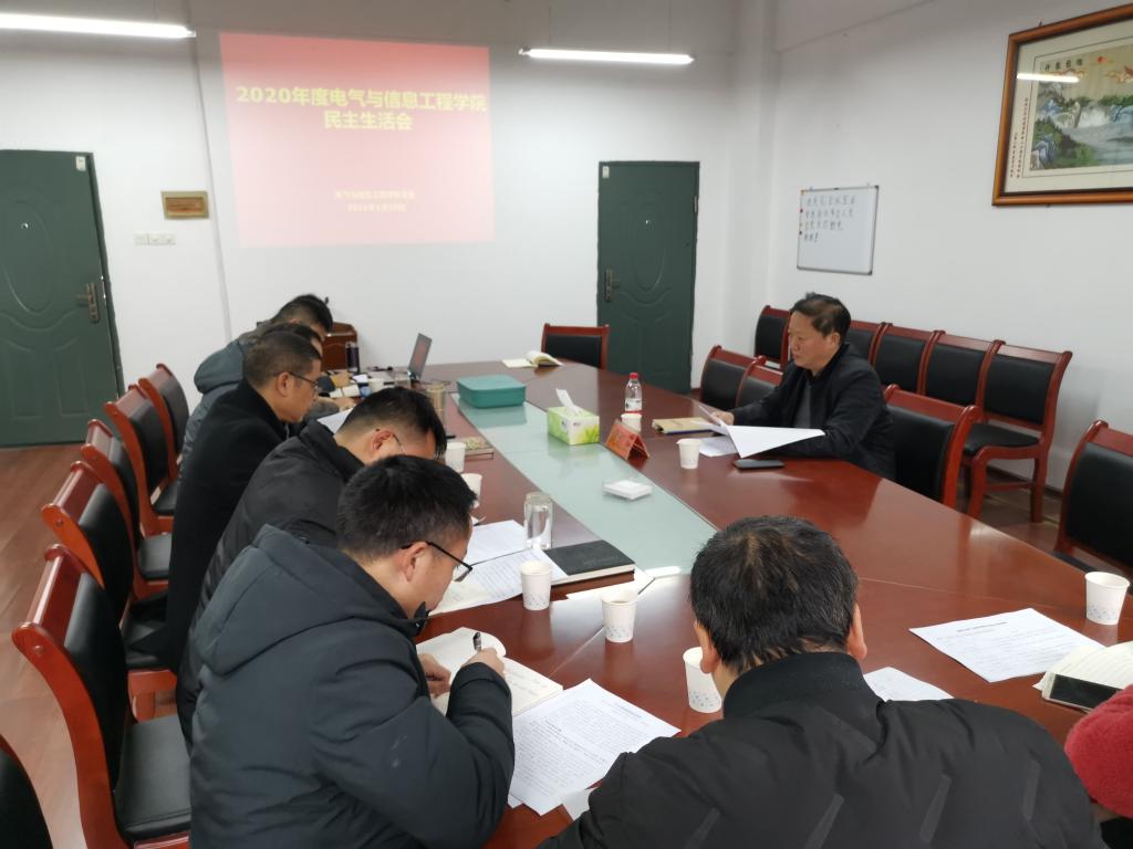 1月25日,电气与信息工程学院党委在电信楼3309会议室召开了2020年民主生活会,会议由党委书记范志明主持,副校长黄红卫到会指导,学院全体党委委员参加会议,电信学院院长九三学社社员李祖林列席了会议。