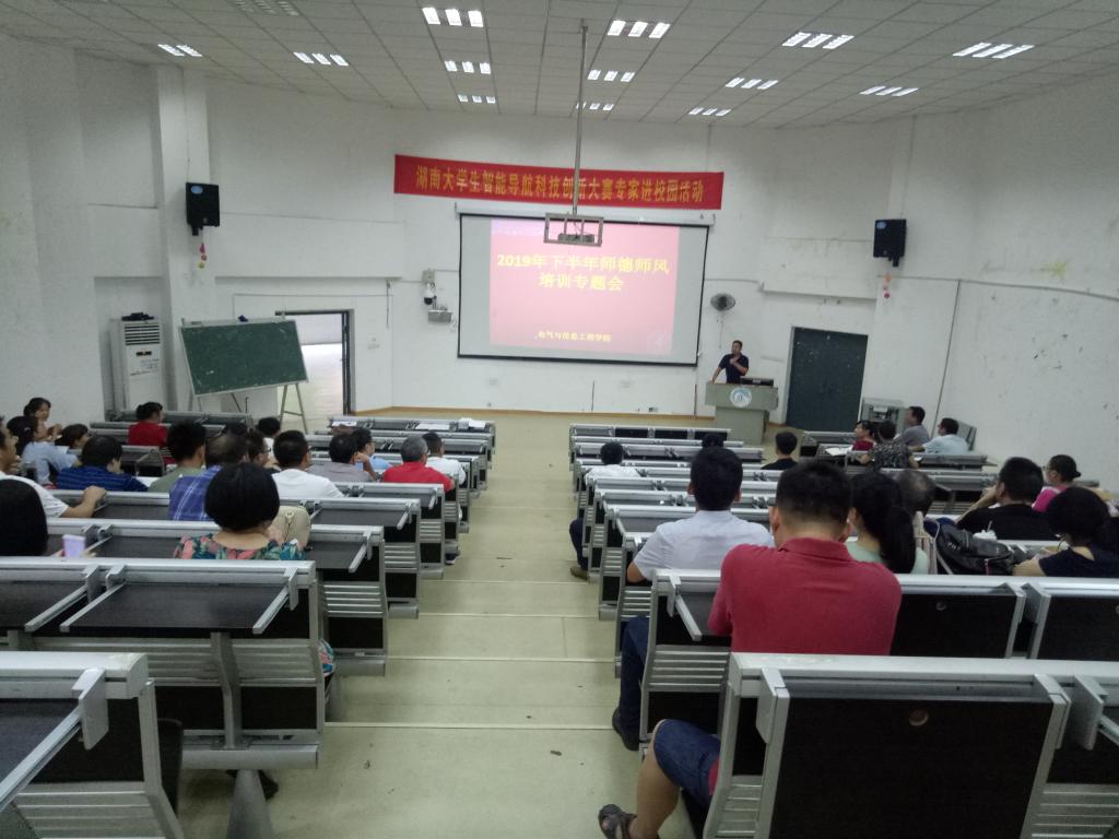 2019年7月5日,电气与信息工程学院在3209召开2019年假期师德师风培训专题会。学院院长李祖林、党委书记/副院长范志明、副院长/党委副书记洪俊、副院长喻霞、党委副书记李治军以及全体电信学院教职工参加会议。会议由李祖林院长主持。