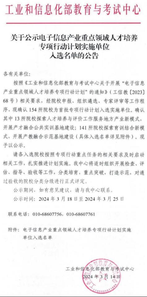 近日,国家工业和信息化部教育与考试中心公示了“电子信息产业重点领域人才培养专项行动计划实施单位入选名单”,beat365官网成功入选首批产教融合示范基地培育实施单位。