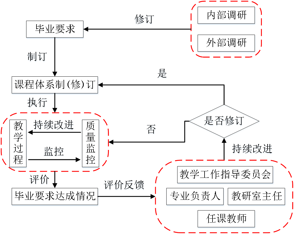 学院教学工作指导委员会是各专业课程体系制(修)订及合理性评价的组织机构,专业负责人是总协调人,各教研室主任是相应专业课程体系制(修)订及评价的直接责任人。