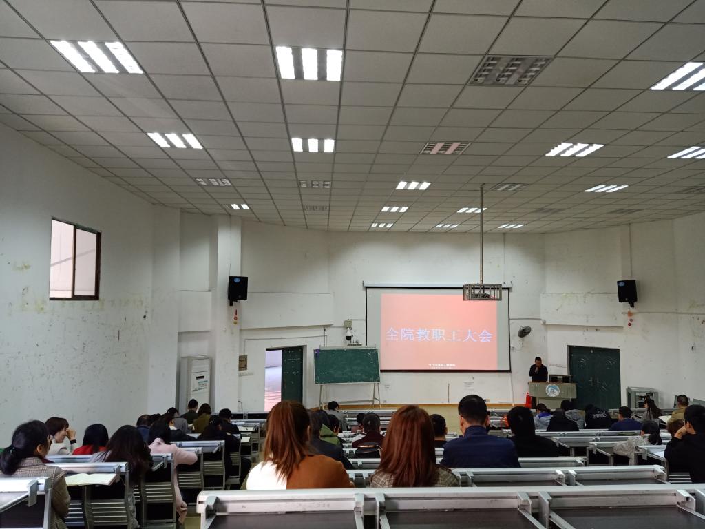 院长李祖林介绍了潘磊、张锁和易继鹏等新入职三位教师,并对他们的到来表示欢迎。会议内容包括刘磊、贾雅琦二位老师职称评审公开述职,全体参会在编教师对学院对两名老师进行无记名投票;副院长喻霞布置了审核评估和期末教学工作,解读了审核评估要点;党委副书记李治军布置了课程思政以及班主任工作;党委书记范志明强调教师要立德树人,加强师德师风建设,带领全院教师学习时代楷模陈立群先进事迹,学习他勇于担当、专注事业的奋斗精神。