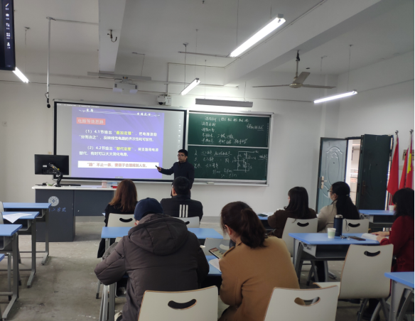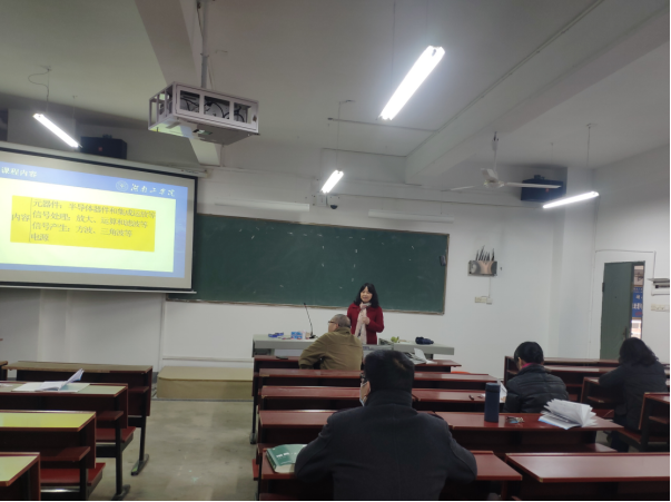 雷美艳老师主讲了《模拟电子技术》公开课,分别从课程简介、课程目标、考核方式、电子技术发展及应用及电子信息系统组成等方面进行了说课,并以“3.1放大电路的基础知识”内容进行了授课展示。雷老师采用PPT课件和黑板板书相结合,板书工整漂亮,理论联系实验项目和工程实例,体现工程思维的培养,教学设计合理,教学方法多样,课程思政收放自如。课后,教师们对课程提出了持续改进的建设性意见,可以适当调整课堂节奏,部分内容讲解可适当精简,进一步的提升课堂教学质量。