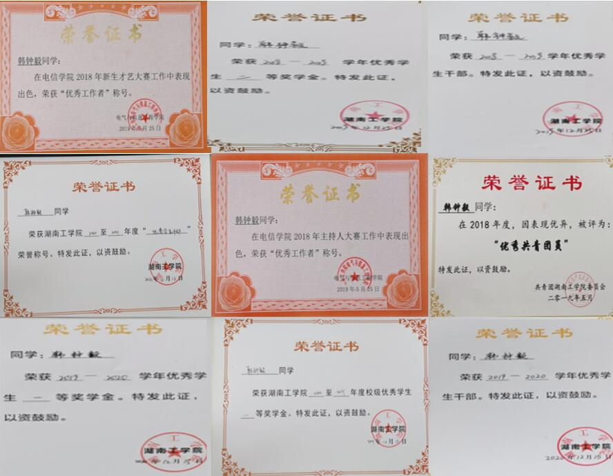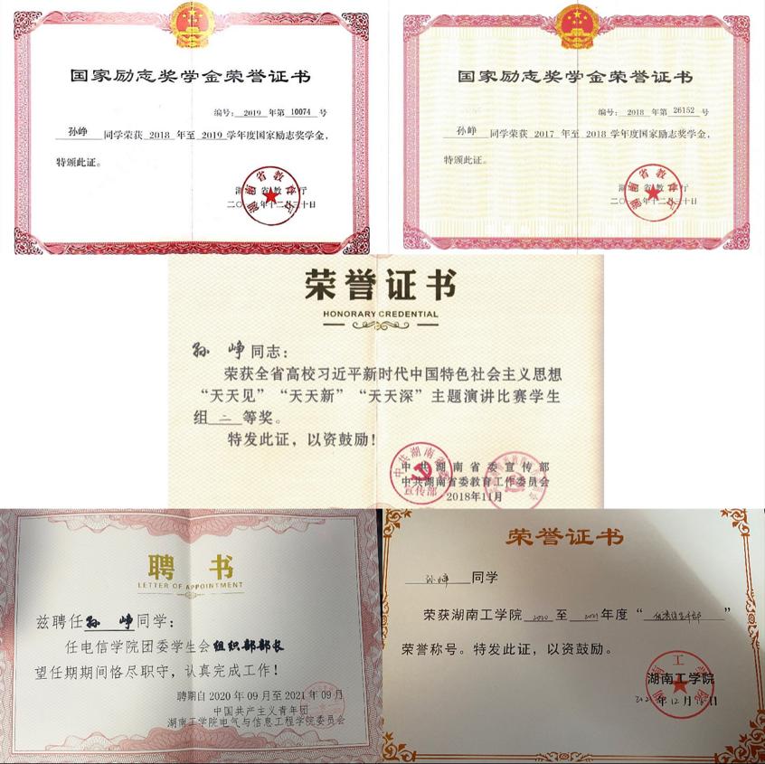 在校期间获得国家奖学金1次、国家励志奖学金2次、校一等奖学金3次、校优秀共青团干1次、校优秀共青团员2次、校优秀干部1次。此外,荣获湖南省挑战杯竞赛三等奖、校互联网+创新创业大赛一等奖、校电子商务大赛二等奖、校圆融杯电子设计大赛二等奖、院主持人大赛一等奖、院职业生涯规划大赛一等奖、院爱国主题征文比赛一等奖等奖项。通过自学获得大学英语六级、国家计算机二级等证书。
