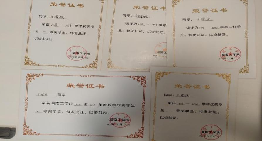 在校期间荣获一次学习成绩和综测均为班级第一,获国家励志奖学金、一等奖学金,二等奖学金、三等奖学金、优秀共青团员,优秀学生干部。