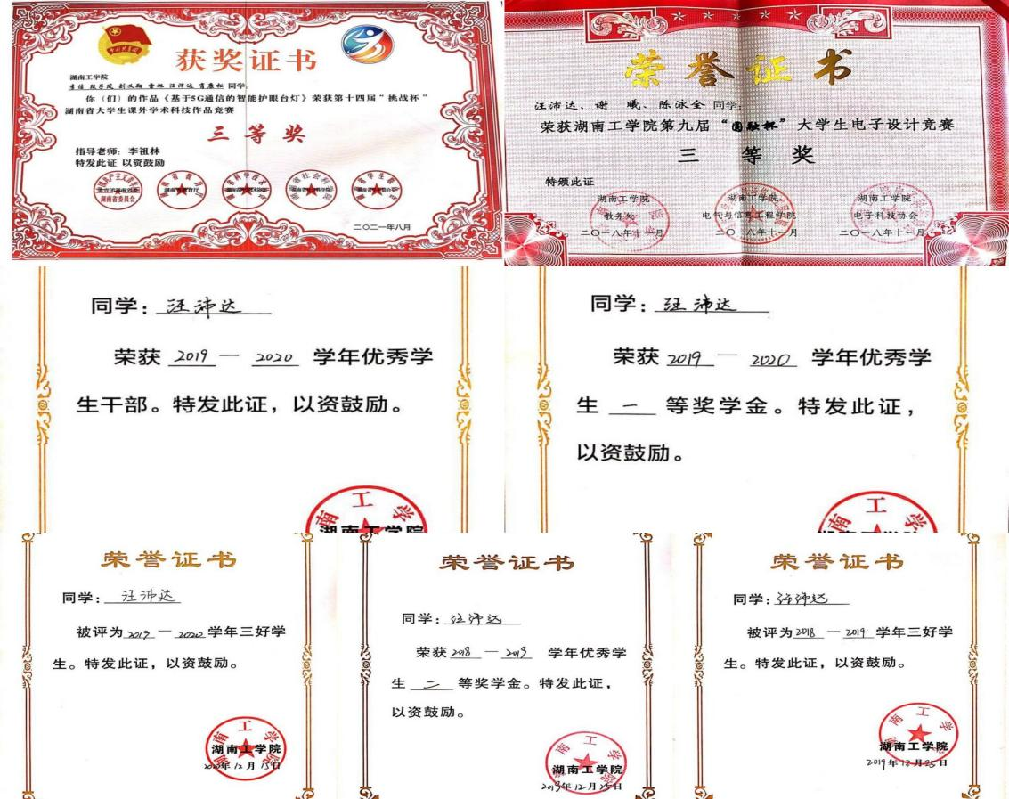 在校期间获国家励志奖学金、二等奖学金、三等奖学金、校优秀工作者、优秀学生干部;2020年国家级大学生创新创业项目负责人。曾积极参与并协助学院创新创业类比赛、电子竞赛等赛事,荣获2020年湖南省大学生电子竞赛三等奖;2021年全国大学生电子竞赛一等奖;校级“圆融杯”、“互联网+”竞赛等奖项;参加“三下乡”大学生社会实践活动。