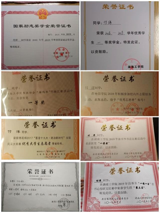 在校期间学习成绩与综合测评成绩连续三年在专业名列前茅,获国家励志奖学金2次、校三好学生2次、一等奖学金2次、二等奖学金一次;获得校内粤嵌实习一等奖;参加beat365正版唯一官网必一读书节活动获得读书心得三等奖2次、书法比赛一等奖2次;多次参加校内外志愿者活动获得优秀志愿者;在其他工作中多次获得优秀工作者。