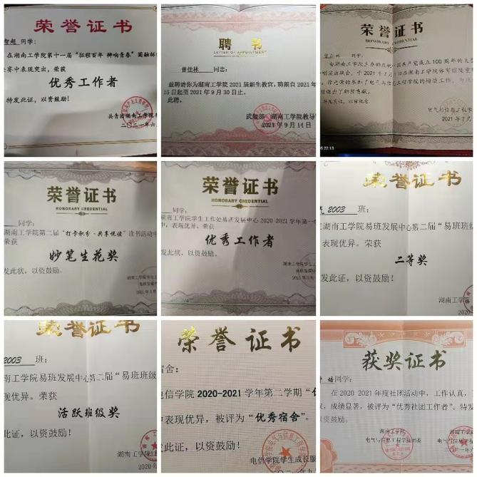 杨智超等多名同学获得“优秀工作者”证书共17张、罗权、伍冠宇获得“军训先进个人”、李进在易班活动中获“妙笔生花奖”、“精诚团结奖”。