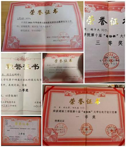 符家慧“第一届寝室设计大赛”校级三等奖;第十届“电协杯”、“圆融杯”、“互联网+”电子创新竞赛;电子科技协会宣传部部长。